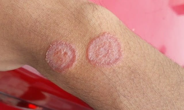 - Red, scaly patches with raised edges