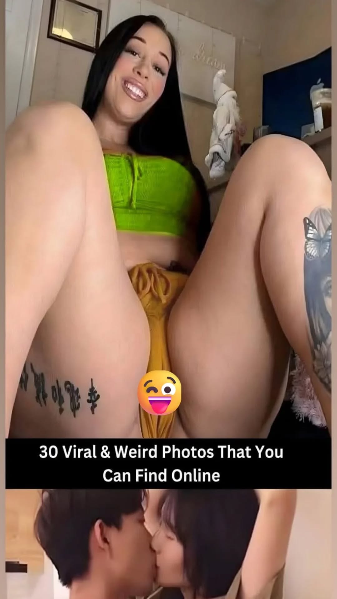 This may contain: a woman in a purple shirt and blue skirt posing for the camera with her hands on her head