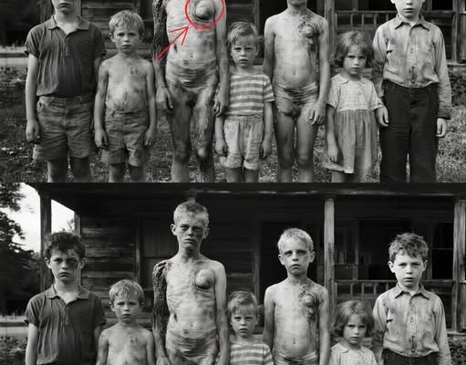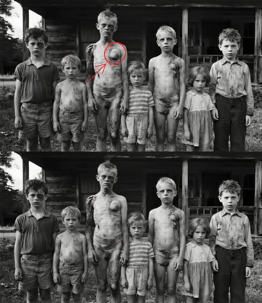 The barn doors stood open. Inside, seven children—estimated to range in age from early childhood to late adolescence—stood shoulder to shoulder. They wore thin, worn clothing inappropriate for the season and showed no visible signs of movement despite the cold.