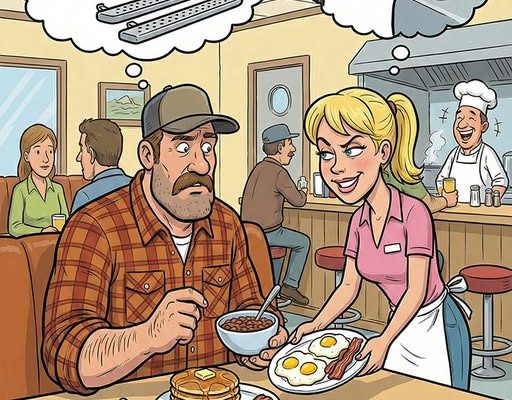 At the pass-through window, she leaned toward the cook and lowered her voice. “There’s a guy out there ordering blowouts, high beams, and side steps. Are we… fixing his truck? Or feeding him?”
