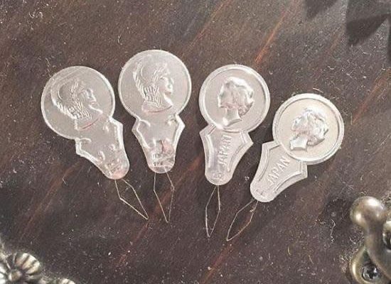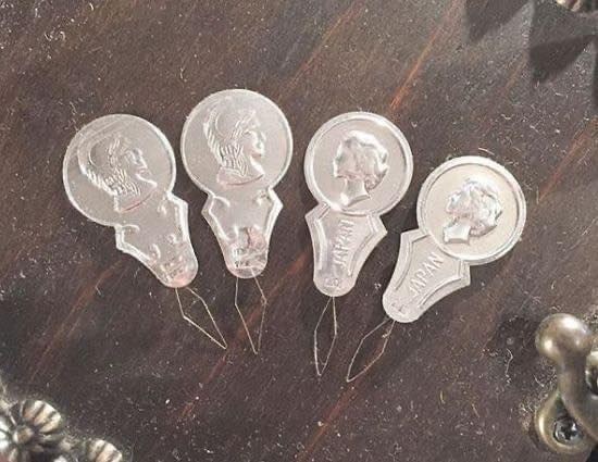 The needle threaders are still used by some people, but those coin-shaped objects with thin wire in a diamond shape were very popular back in the day.