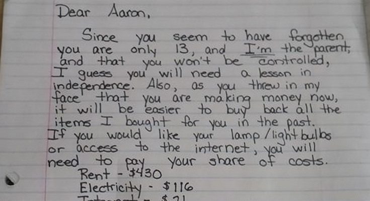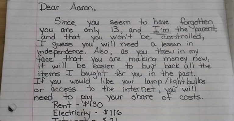 Frustrated after repeated arguments over chores and schoolwork, Heidi decided to leave her son a handwritten letter taped to his bedroom door. The message, though firm, came from a place of love. It outlined what life would look like if Aaron truly wanted to be “independent.”