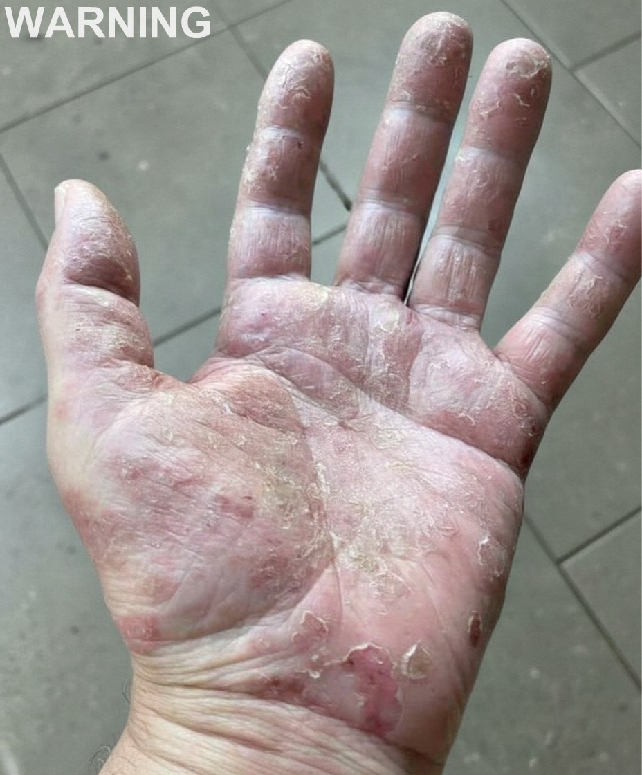 This dermatitis primarily affects the fingertips with thinned skin, pain, and minor itching.
