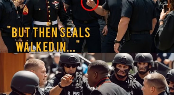 Inside the auditorium, Tyler sat among his graduating class, his eyes anxiously scanning the audience. He’d spotted his dad earlier—that unmistakable frame in Marine blues. Now the seat was empty. He texted his father: “Where are you?” No reply. Ten agonizing minutes passed. A knot formed in his chest. Beside Tyler sat Matteo Alvarez, his childhood best friend, fellow graduate, and newly inducted Navy SEAL. Matteo glanced at Tyler’s phone, read the message, and immediately looked around. “What’s wrong?” asked another SEAL graduate behind them. “My dad’s missing. He was right there. Seat’s empty now.” Matteo’s eyes narrowed. “Your dad is Sergeant Major Elijah Carter, right?” “Yeah.” Without a word, a group of six SEALs rose quietly and left the graduation line. No one questioned them. No one ever did.
