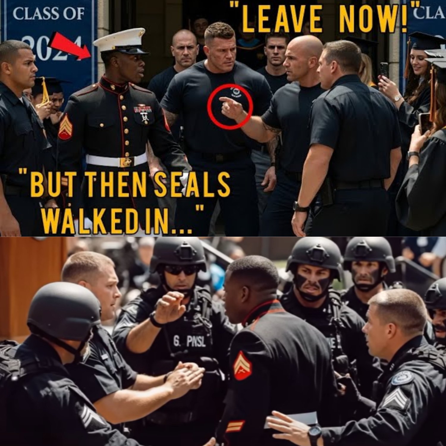 The scene would become legend: a Black Marine, denied entry to his own son’s graduation, only to be escorted in by six Navy SEALs who made the world take notice. It was a moment when the silent battles of dignity and inclusion were fought not with weapons, but with presence, courage, and solidarity. Tyler’s salute, Elijah’s proud reply, and the eruption of applause were more than ceremony—they were a declaration that every hero deserves a seat at the table.