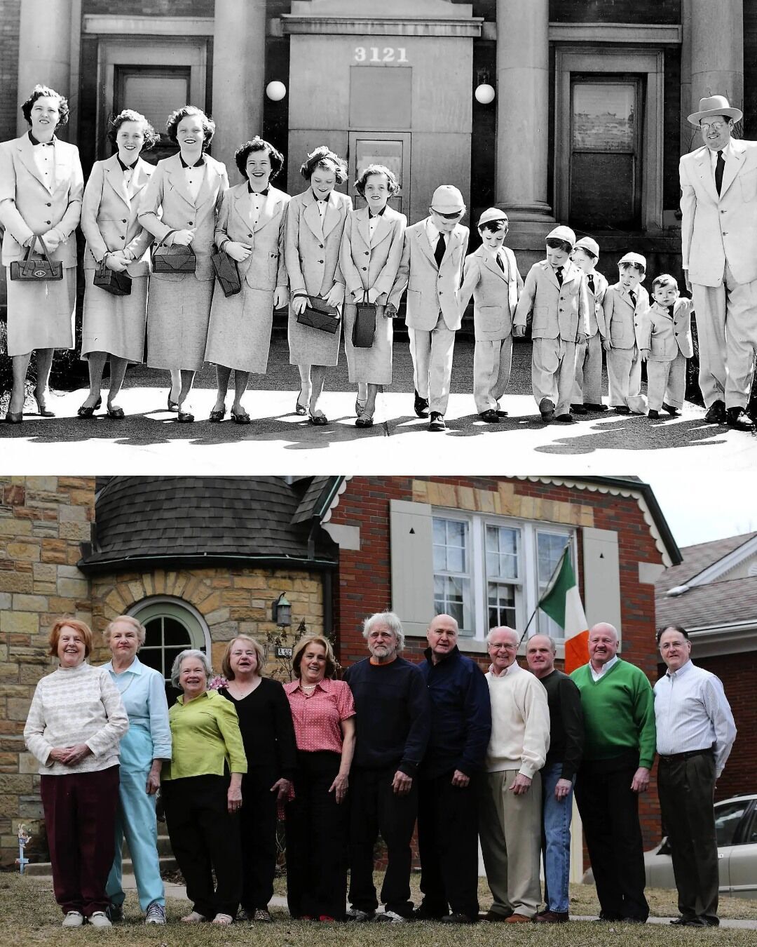 The family’s decision to gather and recreate the photo speaks volumes about their dedication to preserving their shared history. It’s a poignant example of how the bonds formed in childhood can endure, providing strength and comfort throughout life’s journey.