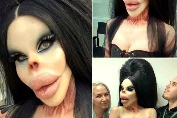 The visual transformation was made possible using prosthetic applications, contouring, texture layering, and strategic lighting, all designed to create the appearance of stretched skin, altered facial structure, and dramatic makeup—elements that mimic the exaggerated results of cosmetic enhancements but were entirely fabricated for artistic effect.