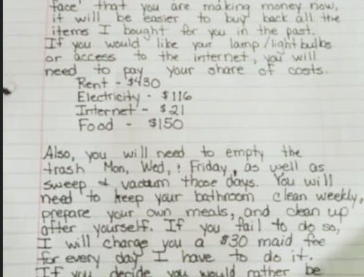 She decided to write a letter that would simulate a real-world scenario, presenting her son with a “roommate contract” designed to reflect the financial and personal responsibilities of independent living.