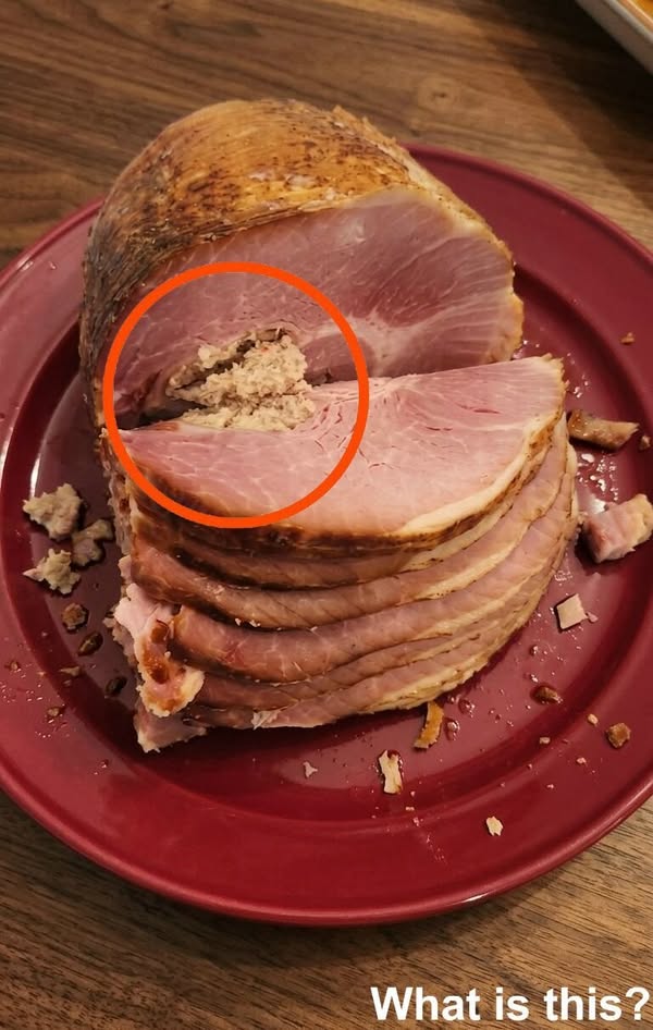 Right there, in the center of the ham, was something unusual. It didn’t match the rest of the meat at all. Instead of the smooth, consistent texture I had been slicing through, this was a compact, grainy mass — almost like a small cluster embedded within. Its appearance was different enough to immediately raise questions.