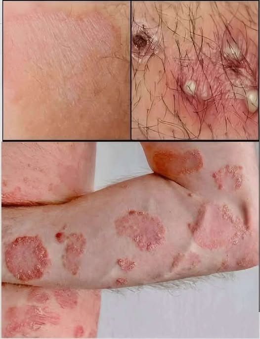 - Red, scaly patches with raised edges
