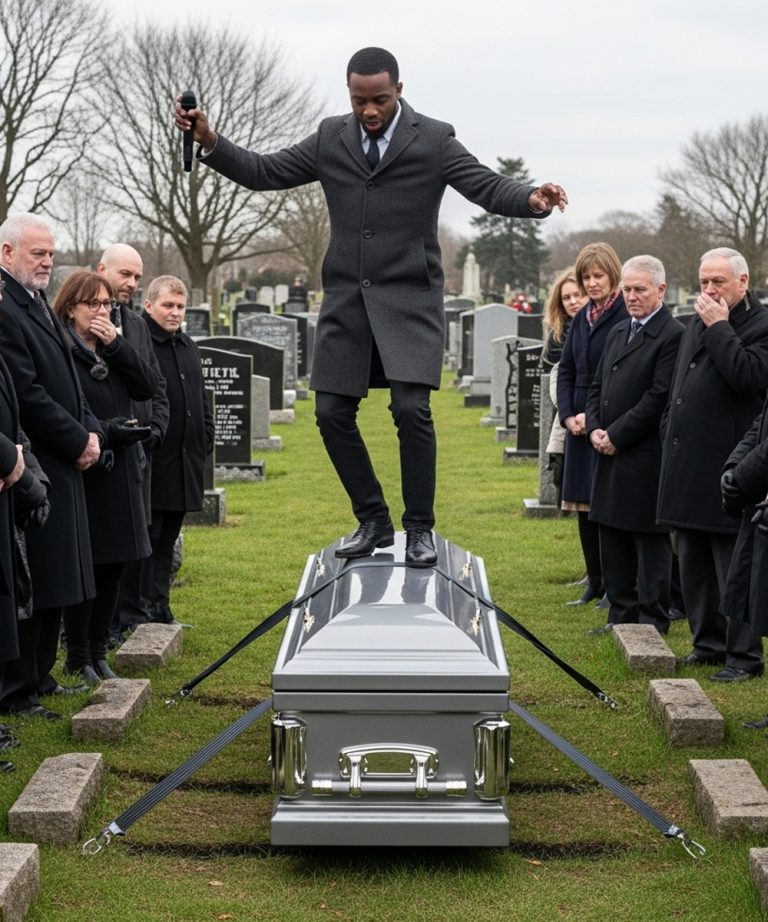He didn’t speak. He didn’t ask permission. In one fluid motion, he climbed onto the coffin, planted his feet, and lifted a wireless microphone to his mouth. A burst of bright, impossible music poured from the portable speakers—drums, brass, a rhythm that belonged to a street parade, not a cemetery. He began to sing. And then, unbelievably, he started to dance—light steps, a half–turn, a joyful snap—balanced on the very box that held his best friend.